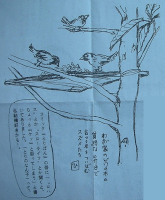 庭は全部菜園にして、野菜作りとマンガ創作の他は、ずっと鳥を眺めて暮らしている人です。庭に来る様々な鳥たちのためにエサ台をいろいろ手作りし、パンくずやリンゴ、ミカン、バナナなどを乗せて、それをついばみに来る鳥たちを観察してはメシのタネ(マンガ)にしているのです。