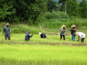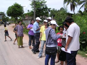 歩いて二時間くらいの点検ルートを定めるために、炎天下の村を一日かけて歩き回った。案内役をつめてくれたのは、ピサノロークの農地改革事務所(ALRO)の職員とバンドン地区の村のリーダーたち。タイ語の通訳をつとめてくれた英語のわかる地元大学生メイさんを含め、みなとても協力的だった。この地を実習現場に選び、地元の協力者を手配しておいてくれたカセサート大学農学部のタワンサックさんに感謝した。