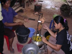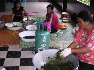 糸取りや製茶を共同で行っている場面に出くわした。一軒の家の庭先で女性たちが数人集まって黄金色の繭を釜で煮て生糸をつむぐ作業を行っていた。この村では養蚕は行っていなくて、繭は他所から購入しているとのことだった。糸を取った後のさなぎの入った洗面器から、二、三個つまみ食いさせてもらった。口に入れて噛むと薄い外皮がぷちっと破れた。中はねっとりと液体状で、昆虫特有のたんぱく質の味がした。製茶の作業場では、携帯用のガスコンロを使って何かの葉を炒っていた。お茶を入れてもらって試飲してみたが、味は日本のお茶とはどこか違うようだった。