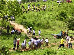 水牛は耕耘機に取って代わった。村を歩くと、耕耘機のエンジンを使ってポンプで灌漑用水路から田に水をくみ上げている場面に出くわした。なるほど耕耘機には水牛にはないこうした便利な使い方もあるのだ。耕耘機やトラクターは目にしたが、水田は区画整理されているわけではなく、田植え機やコンバインも普及していない。田植えや稲刈りは、人を雇ったり、隣近所の共同作業で行われているという。たまたま共同で苗取りを行っている人々を見かけた。多くの村人と子供が参加した植林の現場に立ち会う機会もあった。村にはまだ多くの人が暮らしていて、暮らしには人手を必要とする作業が残