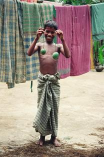 収穫したまだ青い実をぶら下げて見せてくれる少年、うしろに見えるのは、サリーを重ねて刺し子をしたふとん(カタ)である。